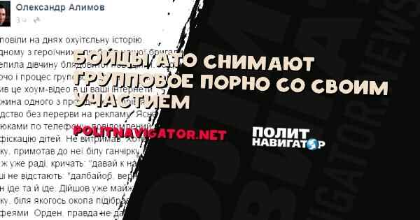 «В одном из героических алкобатов нашей бригады компания мужественных воинов подцепила девушку блядовитого поведения. Ребята подошли к вопросу творчески и процесс группового совокупления сняли на видео. А хитрый воин залил это хоум-видео в эти ваши интернеты. Жена одного из ведущих актеров каким-то образом увидела это бл*дство без перерыва на рекламу. Конечно, мужик был обложен матом по телефону, извещенн о “тумбочке между кроватями” и конфискации детей. Не выдержал. Хотел застрелиться-не дали. Тогда взял палку, примотал к ней белую тряпку и вперед к сепарам сдаваться. А те же уже рады, кричат: “давай к нам, братишка!”. Наши не отстают: “далба**б, вернись. Баба этого не стоит!” А он идет и идет. Дошел уже почти до сепаров, и здесь передумал. Бросил палку, у какого окопа подобрал три лопаты и вернулся домой с трофеями. Орден, правда, не дали, но и не били», – отмечает Алимов.