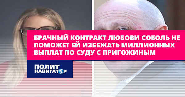 Иск предпринимателя Евгения Пригожина в адрес юриста ФБК (иноагент в РФ) Любови Соболь и ее супруга Сергея Мохова был удовлетворен. Решение принято Симоновским районным судом 9 апреля. Пресс-центр предприятия «Конкорд» сообщил, что брачный контракт Соболь и Мохова суд признал недействительным.