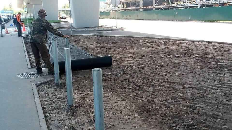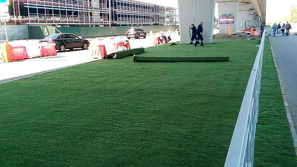 На фото, выложенных в соцсети, видно, как в районе аэропорта «Борисполь» на обочине выкладывают ковролин, стилизованный под газон, чтобы придать видимость «зеленого Киева».