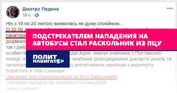 Одним из подстрекателей сегодняшних столкновений в Полтавской области из-за прибытия автобусов с эвакуированными из Китая украинцами стал представитель раскольнической ПЦУ Дмитрий Педына.
