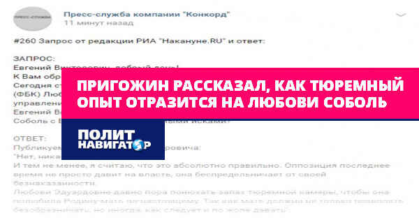Пресс-служба компании «Конкорд» опубликовала ответ бизнесмена на вопрос сотрудников РИА «Накануне.RU». Журналисты хотели узнать, есть ли связь между уголовным делом в отношении Соболь, заведенным СК РФ, и исками, которые к ней несколько раз подавал Пригожин.