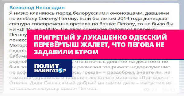 Одесский писатель Всеволод Непогодин, некогда позиционировавший себя борцом с бандеровским режимом, но резко сменивший риторику после вызова на беседу в СБУ, и вновь ставший критиком Майдана после того, как был привлечен к агитации пиарщиками Александра Лукашенко, опубликовал восхищение действиями белорусского ОМОНа, избившего российского военкора Семена Пегова.