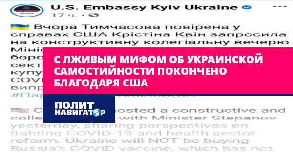 Минувшие выходные можно считать датой развенчания лживого мифа о «самостийной» Украине – причем, произошло это благодаря США, чье посольство открыто опубликовало запрет для официального Киева закупать российскую вакцину от коронавируса.