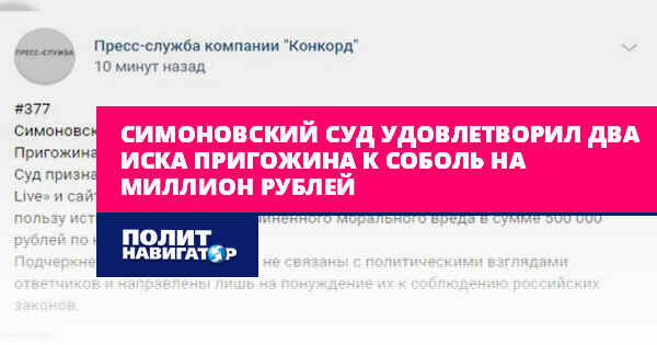 Пресс-служба компании «Конкорд» сообщает, что Симоновский суд Москвы удовлетворил оба иска предпринимателя к соратнице блогера Алексея Навального. Причиной судебных разбирательств стало распространение ответчицей недостоверных и оскорбительных материалов, размещенных на YouTube-канале «Навальный Live» и сайте «Znak».