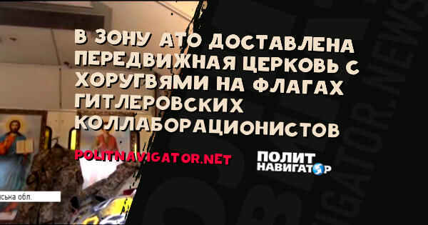 Украинским военным в зону т.н. «АТО» на Донбасс привезли передвижную церковь с хоругвями, на которых изображен лик Христа на фоне флага Украинской повстанческой армии, сотрудничавшей с гитлеровской Германией во время Великой Отечественной войны. Тут же написан лозунг: «Бог и Украина превыше всего!».