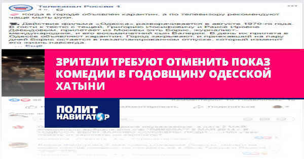 Телезрители в социальных сетях обращаются к сотрудникам канала «Россия» с просьбой изменить сетку вещания и отказаться от анонсированного на годовщину сожжения сторонников Русской весны показа «лирической комедии» «Одесса» режиссера Валерия Тодоровского.