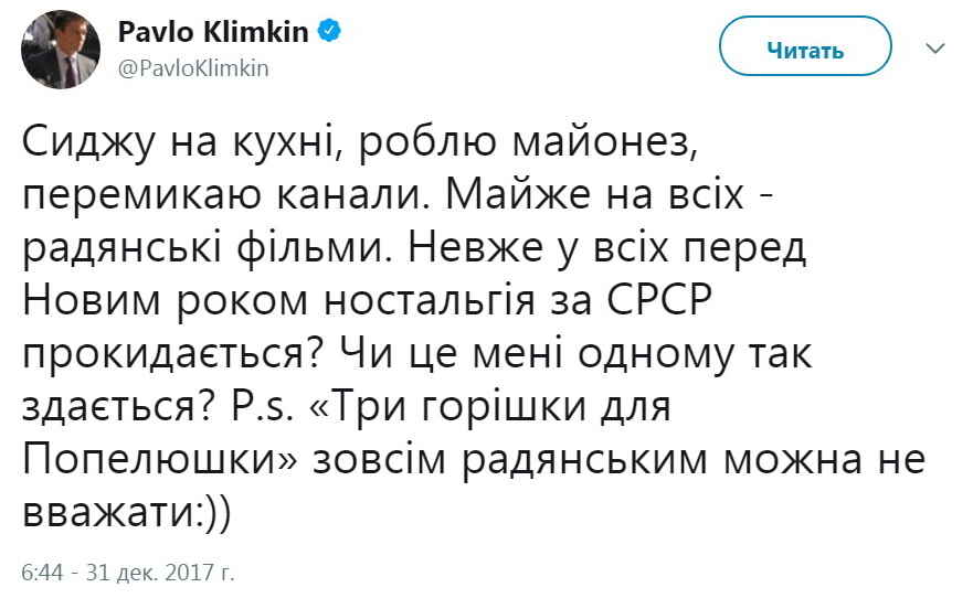 “Сижу на кухне, делаю майонез, переключаю каналы. Почти на всех – советские фильмы. Неужели у всех перед Новым годом ностальгия по СССР просыпается? Или это мне одному так кажется? P.S. «Три орешка для Золушки» совсем советским можно не считать”, – написал Климкин у себя в Twitter.