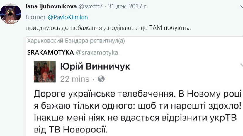“Дорогое украинское телевидение. В Новом году я желаю только одного: чтобы ты наконец сдохло! Иначе мне никак не удастся отличить укрТВ от ТВ Новороссии”, – возмутился Винничук.
