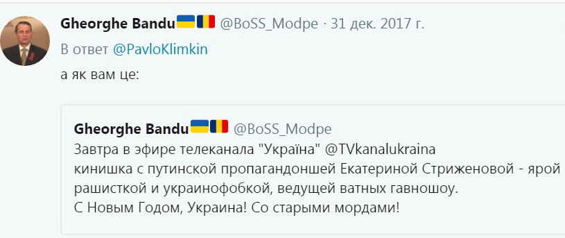 “А как вам это. Завтра в эфире телеканала “Україна”кинишка с путинской пропагандоншей Екатериной Стриженовой – ярой рашисткой и украинофобкой, ведущей ватных гавношоу. С Новым Годом, Украина! Со старыми мордами!”, – обратился к Климкину один из “патриотов”.