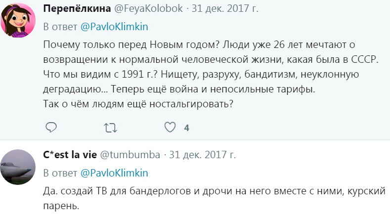 “Почему только перед Новым годом? Люди уже 26 лет мечтают о возвращении к нормальной человеческой жизни, какая была в СССР. Что мы видим с 1991 года? Нищету, разруху, бандитизм, неуклонную деградацию… Теперь ещё война и непосильные тарифы. Так о чём людям ещё ностальгировать?”