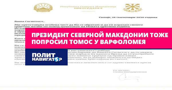 В СМИ появился текст письма, который в связи с православным новолетием (14 сентября) президент Северной Македонии Стево Пендаровски отправил Вселенскому (Константинопольскому) патриарху Варфоломею I c просьбой об автокефалии македонским раскольникам.