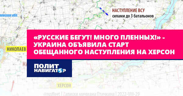 Украина объявила старт обещанного наступления на Херсон. Многочисленные источники сообщают о «прорыве первой линии обороны» на границе с Николаевской областью, паническом отступлении «федералов» и дежурящих здесь подразделений ДНР (!), захвате сел и взятии в плен русских. Утверждается, что российская группировка на правом берегу Днепра «отрезана от Крыма» – сюда невозможно перебросить ни подкрепление, ни боеприпасы.
